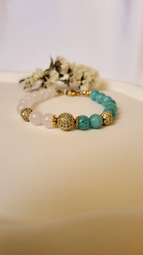 دستبند زنانه سنگ طبیعی آمازونیت و رزکوارتز